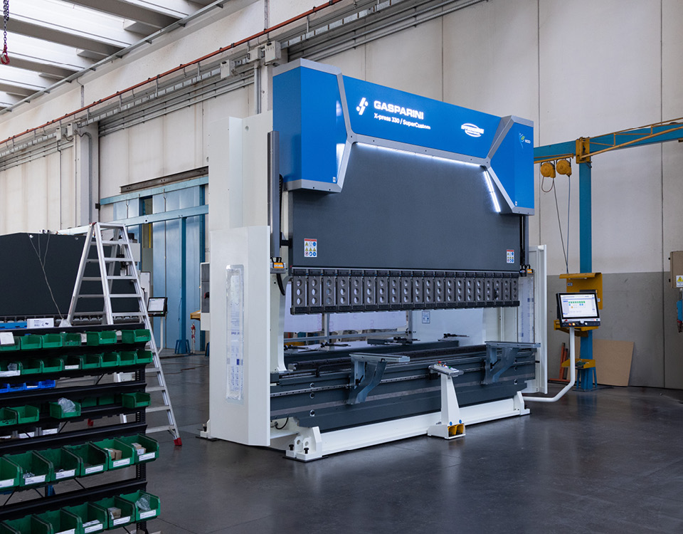 The backgauge is 5-axis (X-R-Z1-Z2-X6) CNC-controlled, and has been implemented with an additional stop and reference, to ensure maximum precision for operators during the bending process of specific parts.